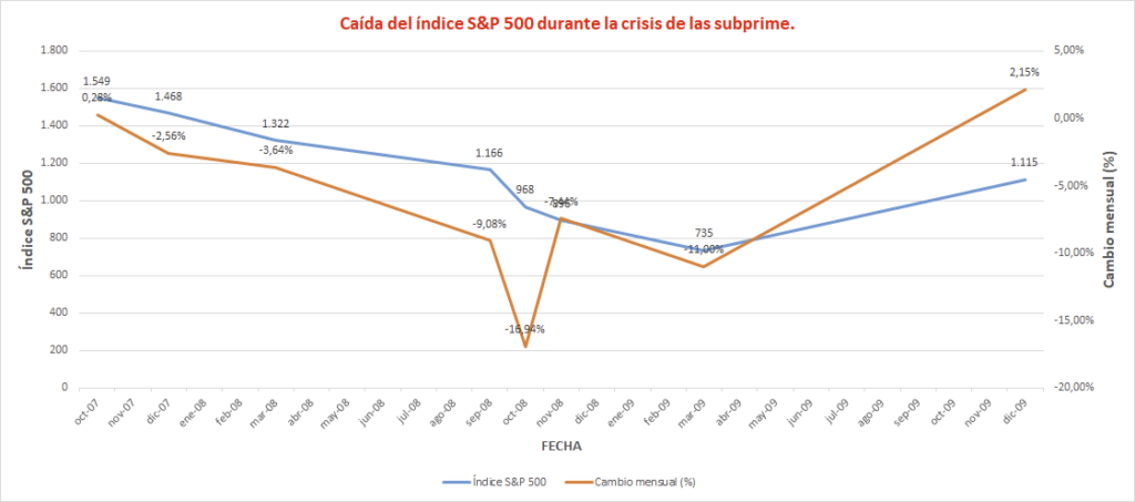 | Crisis financiera 2008 | 2008 | Caída del 57% en el S&P 500 |
