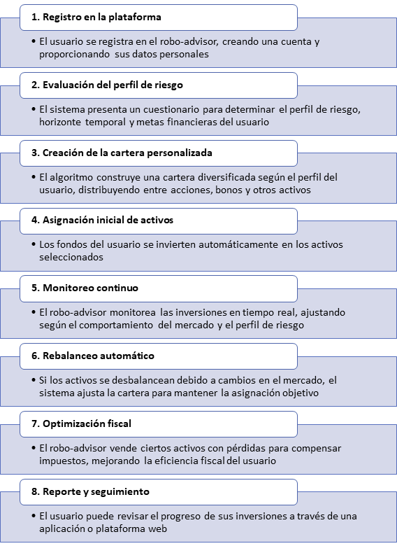 Los robo-advisors automatizan el proceso de inversión, permitiendo que los usuarios deleguen la gestión de sus portafolios sin la necesidad de intervención manual. Este proceso simplifica y optimiza la inversión, realizando automáticamente tareas como la asignación de activos, el rebalanceo de carteras y la optimización fiscal. Todo comienza cuando el usuario proporciona información clave, como sus objetivos financieros, tolerancia al riesgo y horizonte de inversión, y el sistema, mediante algoritmos, ajusta la cartera en consecuencia.