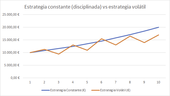 – La Estrategia Volátil tiene ganancias esporádicas pero también fuertes caídas, lo que lleva a un rendimiento inferior en el largo plazo.